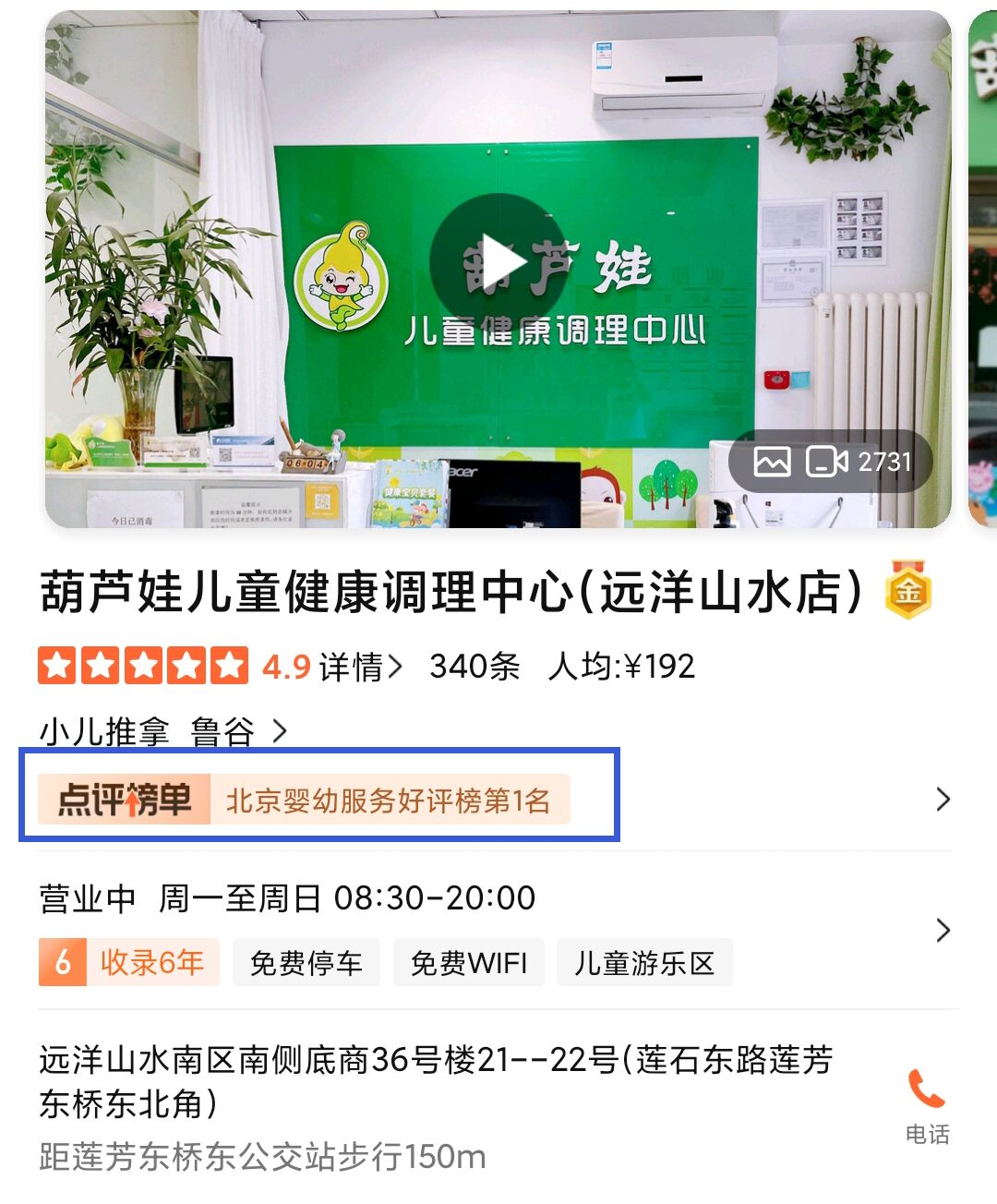 葫芦娃小儿推拿荣登大众点评北京婴幼服务好评榜&热门榜双第一